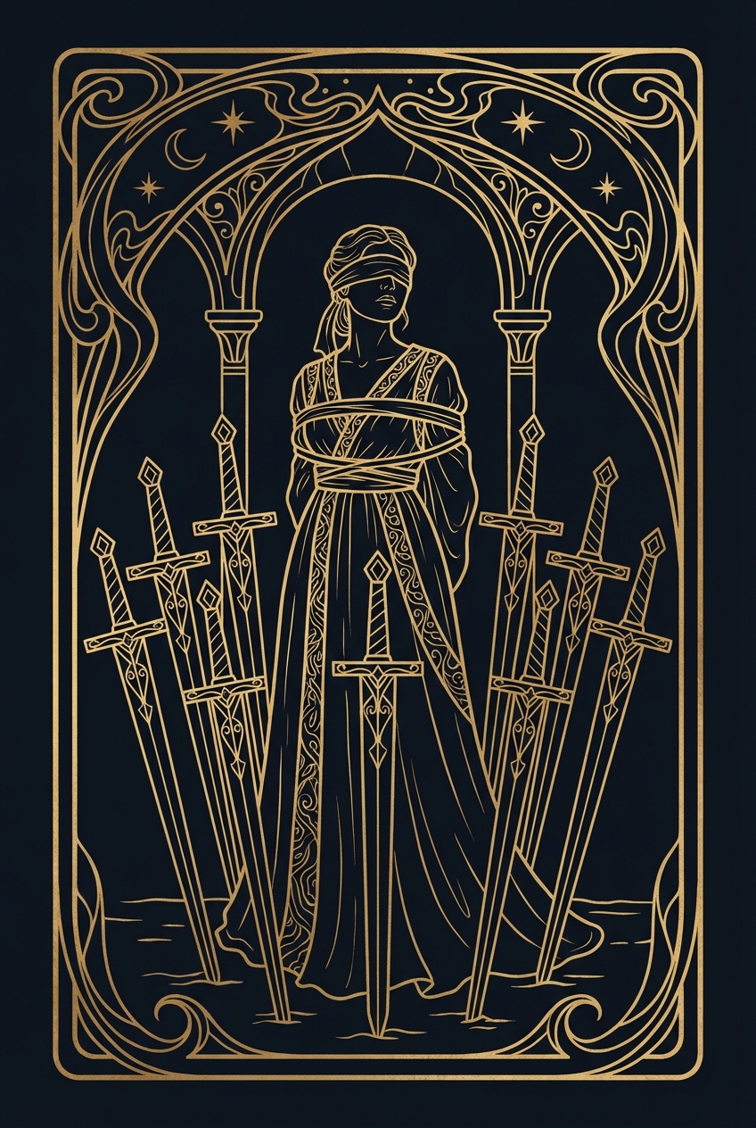 A blindfolded and loosely bound figure stands surrounded by eight swords planted in the wet ground. A castle looms in the distance, and water pools around her feet. She appears trapped — but look closer. The bindings are loose enough to slip. The swords form a fence, not a cage. The path between them, while narrow, is open. The Eight of Swords is the card of self-imposed imprisonment, the situation where the walls that hold you are built more from belief than from brick. When this card appears, you feel stuck. Genuinely, desperately stuck. Every option seems blocked, every escape route closed. But the Eight of Swords delivers a truth that is both liberating and uncomfortable: most of what traps you is your own perception. The blindfold is not locked — you could remove it. The bonds are not tight — you could slip them. The swords are obstacles, but they are not a sealed room. This is not a dismissal of your suffering. The feeling of being trapped is real even when the trap is not. Fear, anxiety, self-doubt, and the internalized voices of people who told you that you could not — these are powerful constraints. The Eight of Swords acknowledges their power while insisting that you have more agency than you currently believe. The card often appears during periods of intense anxiety or overthinking, where the mind generates worst-case scenarios faster than it can evaluate them. Each imagined catastrophe becomes another sword in the ground. Eventually the forest of fears feels impassable, not because it is, but because you stopped looking for the gaps. Start small. Remove one blindfold — challenge one assumption. Test one bond — take one small action. The moment you move, the illusion of total imprisonment begins to crack.