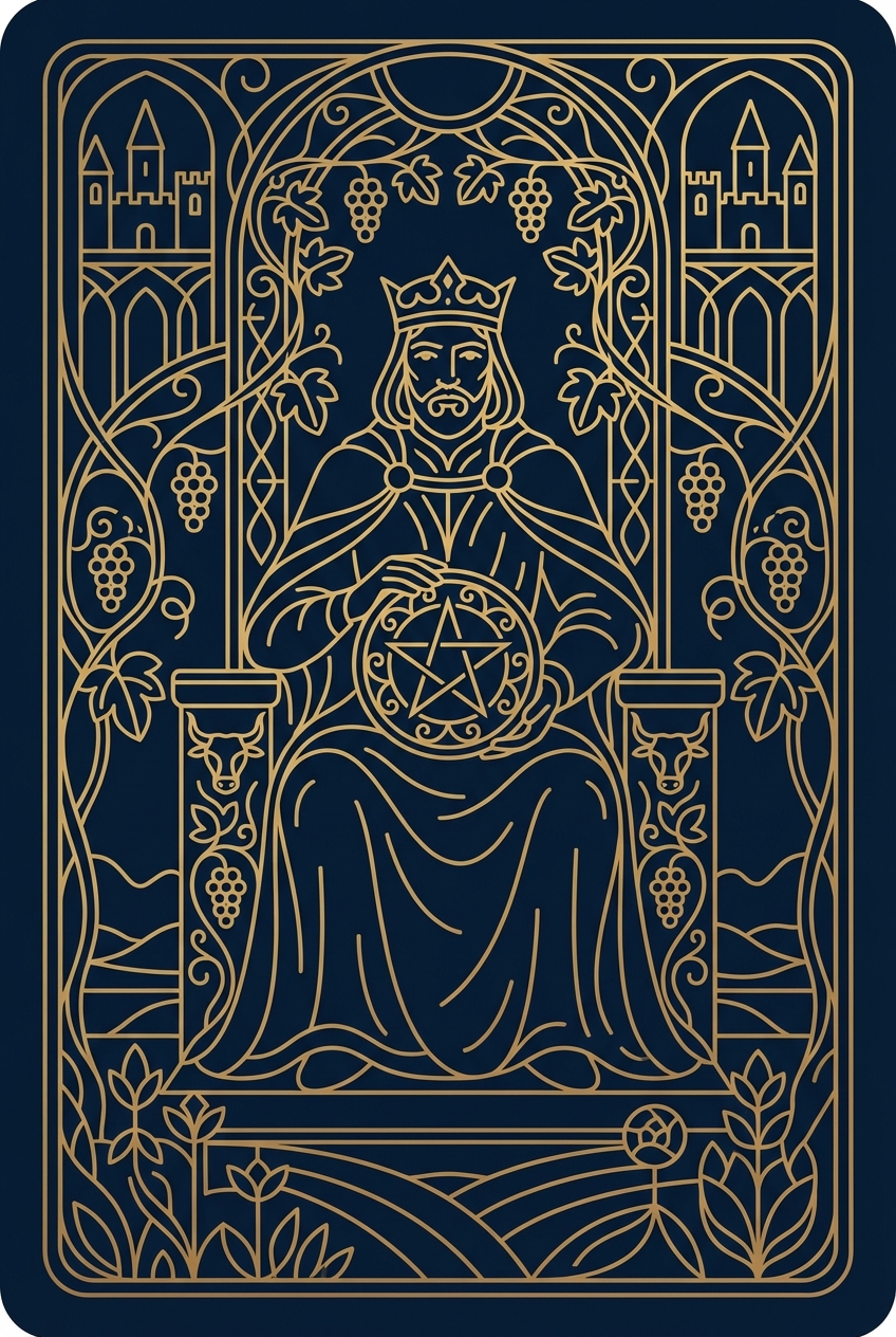 A regal figure sits on a throne carved with bull motifs, his robe embroidered with grapevines and his castle visible in the background. He holds a golden scepter in one hand and a pentacle in the other — power married to wealth. The King of Pentacles is the ultimate card of material mastery. He has built, invested, managed, and expanded until his domain is unshakable. When this card appears, it represents either you or someone in your life who has achieved financial success through discipline, intelligence, and patience. The King of Pentacles did not get rich quickly. He got rich permanently. Every asset in his portfolio was earned through work, protected through planning, and grown through reinvestment. His wealth is not fragile because it was not built on luck. This card embodies the Midas touch grounded by wisdom. The King of Pentacles does not chase every opportunity — he selects the ones with the strongest fundamentals and commits to them fully. He understands that real wealth comes from owning assets, not displaying them. His castle is impressive, but it functions as a home and a headquarters, not a monument to ego. Practically, the King of Pentacles calls you to manage your resources with the seriousness of someone building a dynasty. Budget meticulously. Invest conservatively. Spend on quality that lasts rather than novelty that fades. Take the long view on every financial decision, and prioritize stability over spectacle. The King of Pentacles reminds you that true wealth is not about having the most — it is about needing the least while having more than enough. That is security. That is freedom. That is mastery.