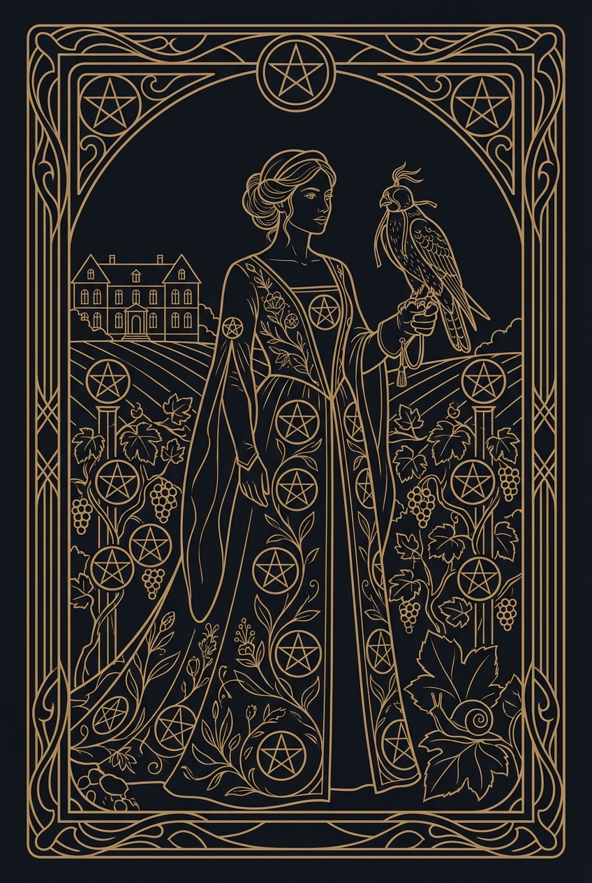 Nine Of Pentacles is one of the most recognizable cards in the tarot deck. In a reading, this card signals a woman stands alone in a vineyard heavy with ripe grapes and golden coins. A hooded falcon perches on her gloved hand — wild power, tamed through patience and skill. Whether you have drawn Nine Of Pentacles in a love reading, career spread, or daily guidance pull, its meaning shifts depending on position and context. Below you will find the upright meaning, reversed interpretation, and specific guidance for love and career — everything you need to understand what Nine Of Pentacles is telling you right now. For a personalized interpretation of Nine Of Pentacles in your specific situation, try our free tarot reading tool.