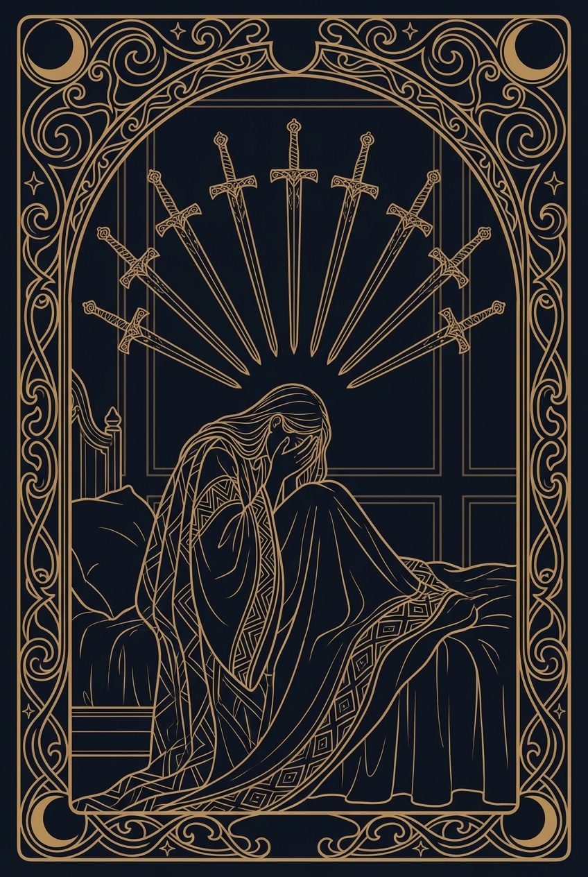 Nine Of Swords is one of the most recognizable cards in the tarot deck. In a reading, this card signals a figure sits upright in bed, head in hands, in the dark hours of night. Nine swords hang on the wall behind them in a horizontal row, like a rack of accumulated anxieties. Whether you have drawn Nine Of Swords in a love reading, career spread, or daily guidance pull, its meaning shifts depending on position and context. Below you will find the upright meaning, reversed interpretation, and specific guidance for love and career — everything you need to understand what Nine Of Swords is telling you right now. For a personalized interpretation of Nine Of Swords in your specific situation, try our free tarot reading tool.