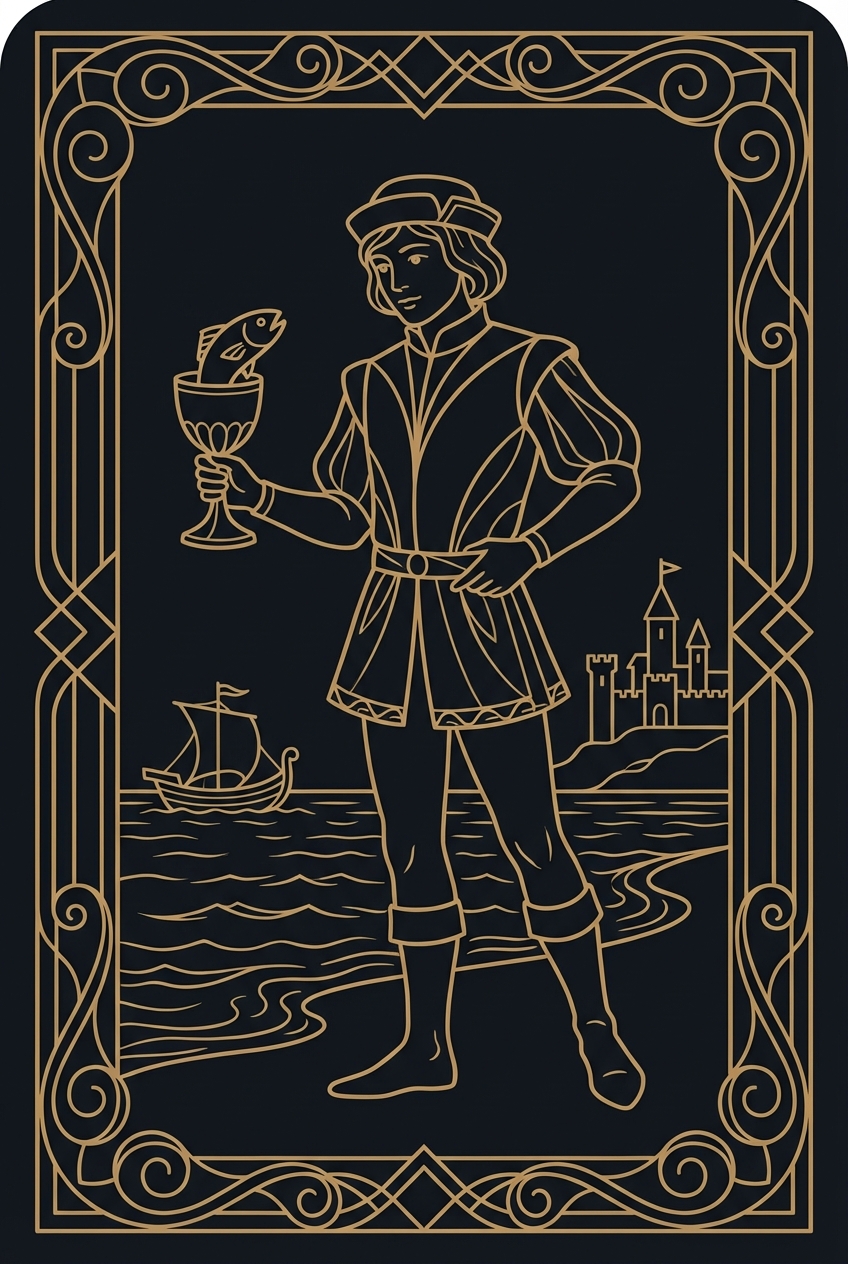 A young figure in an ornate tunic stands at the water's edge, holding a golden cup from which a small fish pops up unexpectedly. The Page looks at the fish with curiosity rather than alarm — this is someone who greets the strange and wonderful with delight rather than suspicion. The Page of Cups is the card of emotional openness, creative stirring, and messages from the intuitive depths. When this card appears, something is emerging from your emotional or creative unconscious. It could be a new feeling — the first flutter of attraction, a wave of tenderness, a sudden impulse to write or paint or sing. The Page of Cups does not arrive with a fully formed masterpiece; it arrives with a spark and a question: "What would happen if you followed this?" This card represents the beginner phase of emotional exploration. You are learning a new way of feeling — perhaps after a period of emotional shutdown, or perhaps for the first time. There is an innocence here that is powerful precisely because it has not yet learned to censor itself. The Page of Cups feels before thinking, and that raw responsiveness is both their gift and their vulnerability. Practically, the Page of Cups can signal a message or communication with emotional significance — a love letter, a heartfelt text, an unexpected invitation, or news that stirs your feelings. Pay attention to what arrives in your inbox, your mailbox, or your conversations during this period. The fish in the cup says: the message will come from an unexpected source. Let yourself be surprised. Let yourself be moved. The Page of Cups reminds you that the most interesting things in life show up uninvited and unplanned. Your only job is to stay curious enough to notice them.