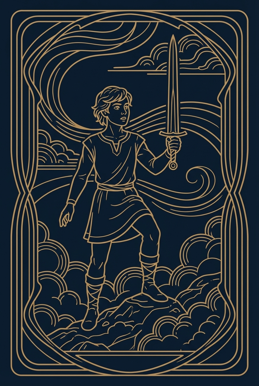A young figure stands on uneven ground, holding a sword upright with both hands, body facing one direction while the head turns another — alert, watchful, ready. Wind blows through the sky behind him, stirring clouds into rapid movement. Birds wheel overhead. The Page of Swords is the card of sharp curiosity, the restless mind that questions everything and accepts nothing at face value. When this card appears, intellectual energy is running high. You are in discovery mode — researching, questioning, gathering information, and challenging assumptions. The Page of Swords is not content with surface explanations. He wants to know why things are the way they are, who decided, and whether a better way exists. This energy is exhilarating but can also be exhausting for everyone in its path. This card often represents a new idea or a fresh perspective that excites you. A course of study, a writing project, an investigation, or simply a question that has seized your attention and refuses to let go. The Page of Swords favors intellectual honesty above diplomatic comfort — he would rather speak an uncomfortable truth than maintain a comfortable lie. The wind in the image suggests that this intellectual energy is volatile and hard to direct. The Page has the sword but not yet the discipline to wield it with precision. Ideas come fast but may lack follow-through. Communication is sharp but may lack tact. The enthusiasm for truth may not yet include the wisdom to know when and how to deliver it. Channel this energy intentionally. Write down your ideas before they scatter. Choose one line of inquiry and pursue it deeply rather than skimming five topics. And remember that truth is best served with a measure of kindness — the Page has not yet learned this, but you can.