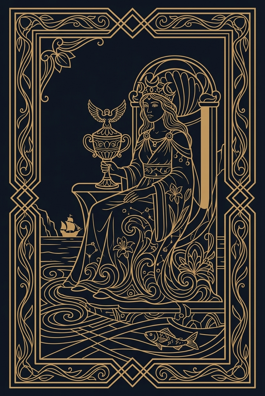 The Queen sits on her throne at the water's edge, holding an elaborate, closed cup — the only enclosed chalice in the entire suit. She gazes at it with contemplation, not drinking but guarding. Cherubs adorn her throne, and the sea behind her is calm. The Queen of Cups is the card of emotional mastery, deep intuition, and compassionate wisdom that knows when to feel and when to contain. When this card appears, you are being called to operate from a place of emotional intelligence rather than emotional reaction. The Queen of Cups feels everything — she is not detached or cold — but she has developed the maturity to hold her feelings without being controlled by them. This is not suppression. This is sovereignty. She chose to close the cup because some feelings are too sacred to spill publicly. The Queen of Cups is the most intuitive figure in the tarot court. Her relationship with the unconscious mind is fluid and natural. Hunches, dreams, gut feelings, and subtle emotional signals that others miss — she reads them all with practiced ease. When this card appears, trust your intuition emphatically. The rational mind will catch up later, but your emotional radar is picking up accurate signals right now. This card also represents deep compassion — the kind that heals without depleting. The Queen of Cups can sit with someone in pain without absorbing that pain as her own. She offers presence, not solutions. She listens without fixing. If someone in your life needs that kind of support right now, you are equipped to provide it. The Queen of Cups reminds you that emotional depth is a form of power. In a culture that often prizes logic over feeling, this card says: your sensitivity is not a liability. It is your most sophisticated instrument. Use it wisely.