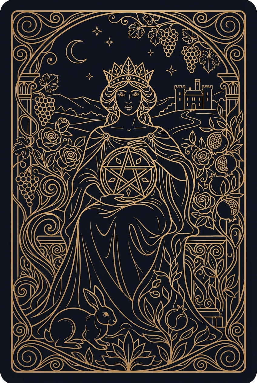 A serene woman sits on a stone throne adorned with carved fruit and flowers, cradling a golden pentacle in her lap like a beloved child. A rabbit hops at her feet — fertility, abundance, and quick instinct in a grounded body. The garden around her is immaculate, not because she hired someone to tend it but because nurturing living things is her nature. The Queen of Pentacles is the card of practical nurturing, material abundance, and the grounded wisdom of someone who knows how to make things grow. When this card appears, it describes either you or someone in your life who embodies domestic mastery and financial intelligence. The Queen of Pentacles runs a household, a business, or a team with competence that looks effortless because she has been doing it so long the skill is invisible. She feeds people — literally and figuratively — and the environment she creates makes everyone feel taken care of. This card celebrates the intersection of nurturing and practicality. The Queen of Pentacles does not just love you — she makes sure you ate, that your budget is balanced, that the roof does not leak, and that the garden produces enough for winter. Her care is expressed through action, not sentiment. She is the person who shows up with soup when you are sick and a spreadsheet when you are broke. Practically, the Queen of Pentacles calls you to ground your ambitions in physical reality. Dream big, but also meal-prep. Build an empire, but also walk in the garden. The highest wisdom this card offers is that material well-being and spiritual richness are not opposites — they are partners. The Queen of Pentacles reminds you that abundance begins at home. Tend what is closest before reaching for what is farthest.