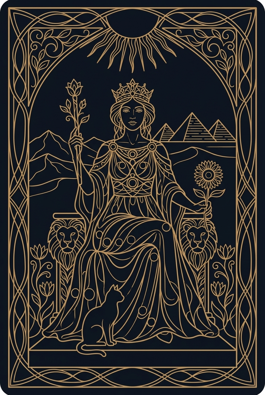 The Queen of Wands sits on her throne with a sunflower in one hand and a wand in the other, a black cat at her feet. She is warmth and power in equal measure — magnetic, creative, and utterly self-possessed. Where the Knight of Wands charges, the Queen commands. Her fire is not reckless; it is radiant. When this card appears, it calls you to step into your full creative power with the confidence of someone who knows exactly who they are. The Queen of Wands does not seek validation. She does not shrink to make others comfortable. She walks into a room and the room rearranges itself around her energy — not through force, but through presence. This card represents creative mastery — not just having ideas, but executing them with warmth and skill. The Queen builds empires out of passion projects. She turns vision into reality and inspires others to do the same. Her leadership style is generous: she lifts others as she rises, creating warmth wherever she goes. The Queen of Wands also speaks to social confidence and the ability to connect with people from all walks of life. She is the host who makes everyone feel welcome, the leader who remembers your name, the friend who champions your dreams as fiercely as her own. Practically, this card appears when you need to lead with both heart and fire. Present with confidence. Network with genuine warmth. Pursue your creative vision without apology. The Queen of Wands does not wait for permission — she grants it to herself.