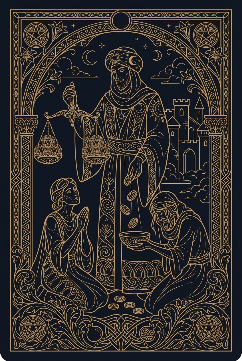 A wealthy merchant holds a balanced scale in one hand while distributing coins to kneeling figures with the other. The Six of Pentacles is the card of generosity, resource circulation, and the complex dynamics of giving and receiving. It asks you to examine which role you currently occupy — the giver, the receiver, or the one holding the scale. When this card appears, resources are flowing, and fairness is the guiding principle. If you are in a position of abundance, the Six of Pentacles calls you to share. Not performatively, not conditionally, but with genuine care for those who need what you can afford to give. Your generosity right now has the power to change someone else's trajectory. If you are the one receiving, this card validates that there is no shame in accepting help. The Six of Pentacles insists that the economy of kindness requires both givers and receivers to function. Receiving gracefully is its own form of generosity — it allows the giver to experience the fulfillment of making a difference. This card also carries a subtle complexity. The merchant stands while the recipients kneel. The scale suggests measurement. True generosity has no ledger, yet the Six of Pentacles acknowledges that power imbalances exist in every exchange. Give without creating dependency. Receive without surrendering dignity. Practically, the Six of Pentacles often signals a charitable donation, a loan, a raise based on merit, or a mentor investing time in your growth. Whatever form it takes, the flow of resources is fair and purposeful. Trust it.