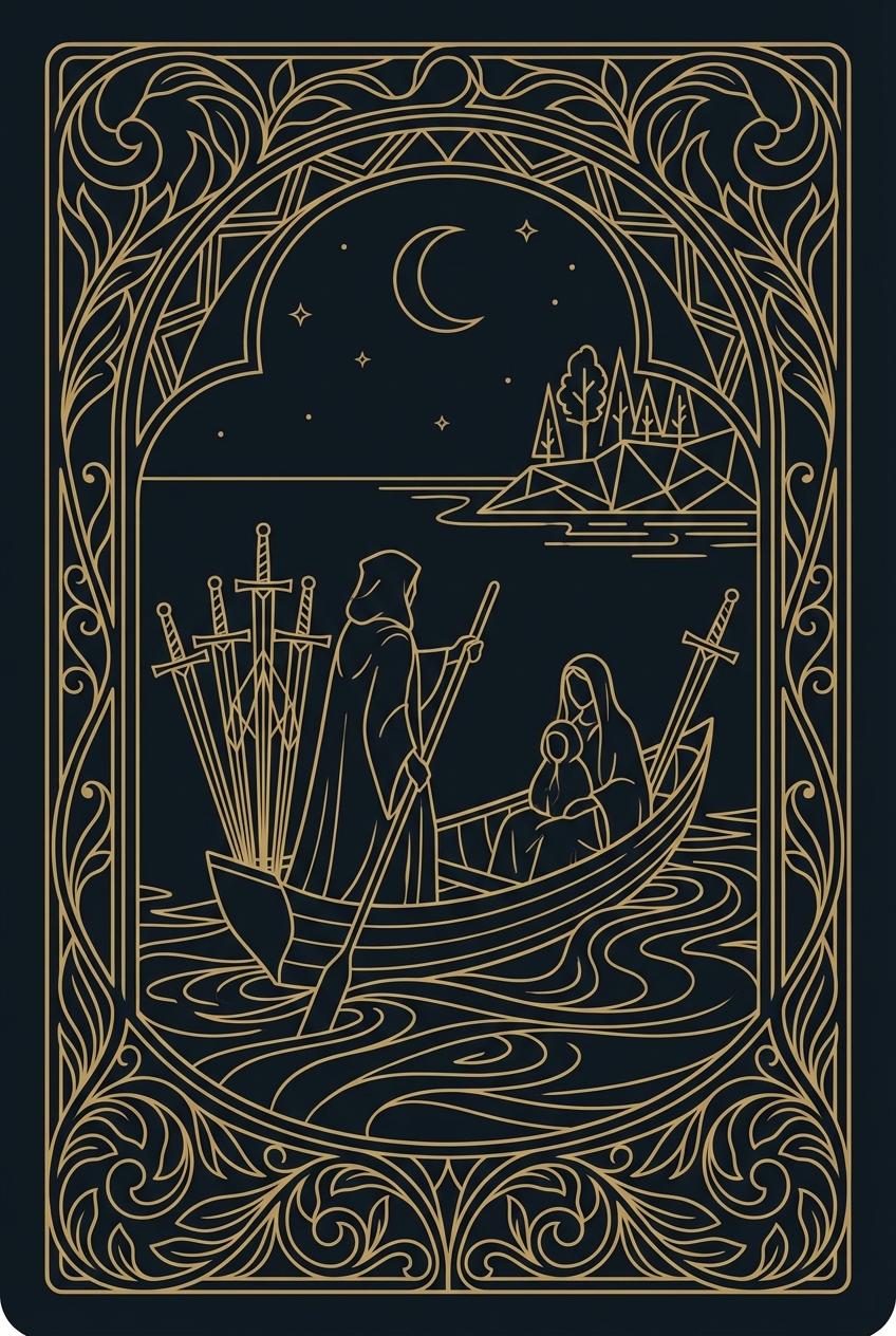 A ferryman guides a small boat across water. A cloaked figure and a child sit in the vessel, six swords standing upright in the bow. The water on one side is choppy; on the other, it calms. They are moving from turbulence to tranquility — not arrived yet, but clearly in transit. The Six of Swords is the card of necessary transition, the bittersweet journey from what was painful to what will be better. When this card appears, you are leaving something behind. It might be a relationship, a job, a city, a belief system, or simply a version of yourself that no longer fits. The departure is not joyful — the cloaked figure does not look back with celebration, but with the quiet grief of someone who knows the leaving was necessary even though it hurts. The six swords in the boat represent the baggage you carry with you. The Six of Swords does not promise a clean break. You will bring your memories, your lessons, and some of your wounds into the next chapter. But notice that the swords stand upright and orderly — they are organized, managed, carried consciously rather than dragging behind you in chaos. This card often appears during physical relocations, the aftermath of breakups, career transitions, or any period where you are actively moving toward a calmer state of being. The journey may feel slow and the destination unclear, but the direction is unmistakably forward. Trust the ferryman. Trust the current. The calmer waters ahead are not a fantasy — they are the natural reward for having the courage to push away from a shore that was no longer safe.