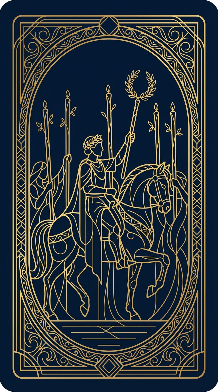 The Six of Wands shows a rider on horseback, crowned with a laurel wreath, moving through a crowd that cheers and raises their own wands in tribute. This is victory — not the quiet, private kind, but the kind that is seen, acknowledged, and celebrated by others. When this card appears, you are being recognized for your efforts. The work you put in is paying off in visible, tangible ways. A promotion, an award, public praise, a viral moment, a personal breakthrough that others notice and honor. The Six of Wands says: you earned this. Stand in it. This card carries important nuance about the relationship between achievement and recognition. Many people do excellent work that goes unseen. The Six of Wands signals a moment where skill and visibility align — where the right people notice at the right time. If you have been working in obscurity, this card announces that your efforts are about to be acknowledged. There is a subtle caution here, too. The rider is elevated, and the crowd is looking up. Success can create distance if you are not careful. Stay connected to the people who supported you on the way up. Gratitude is not just a virtue — it is a strategy for sustaining success. Practically, the Six of Wands favors leadership, public communication, and stepping into the spotlight. If you have been asked to present, perform, lead, or represent your team, say yes. This is your moment, and the energy around you supports triumph.
