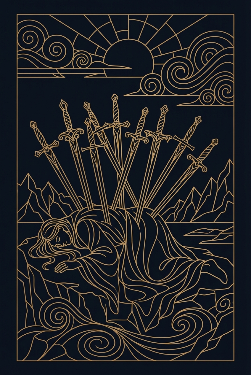 A figure lies face down on the ground, ten swords buried in their back from neck to legs. The sky is dark, but on the distant horizon, a band of golden light begins to break through. The imagery is dramatic — perhaps the most visually alarming card in the deck — and that drama is part of the message. The Ten of Swords marks the absolute bottom, the point where things cannot get worse because worse has already arrived. When this card appears, you are experiencing or have just experienced a complete ending. A betrayal that was thorough, a failure that was total, a loss that left no room for denial. The Ten of Swords does not allow for half-measures or partial collapses. Whatever happened, it was definitive. The old chapter is not winding down — it is over. But this card contains a paradox that separates it from pure despair: when you have hit bottom, the only direction available is up. The golden dawn on the horizon is not decoration — it is the promise embedded in every ending. The Ten of Swords is, beneath its terrifying surface, a card of inevitable renewal. The worst has happened, and you are still here. That fact alone is the foundation for what comes next. This card sometimes carries a note of exaggeration. Ten swords is excessive — one or two would accomplish the same result. The image may be reflecting your perception rather than your reality. Are you experiencing a genuine catastrophe, or have pain and exhaustion turned a significant setback into an apocalypse in your mind? Both deserve compassion, but they require different responses. Let the ending be an ending. Do not try to revive what the ten swords have killed. Grieve it, release it, and turn your face toward the golden light that is already appearing on the edge of your darkness.