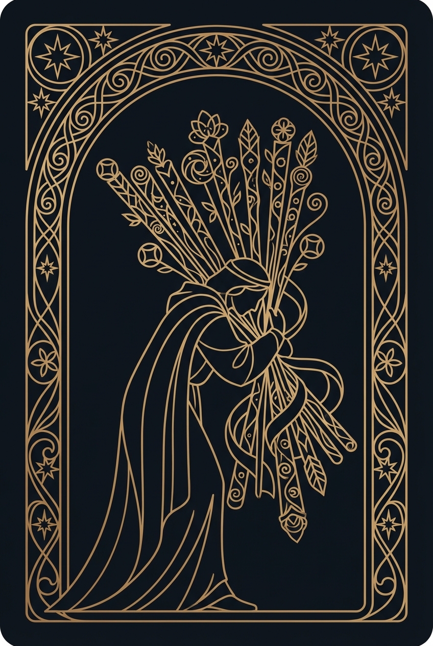 The Ten of Wands shows a figure hunched under the weight of ten heavy wands, struggling toward a distant town. His back is bent, his vision is obscured, and each step costs more than the last. This card is about burden — the kind you carry because you chose to, and the kind you carry because you forgot you could put it down. When the Ten of Wands appears, you are overloaded. Responsibilities have accumulated beyond what is reasonable, and the weight is affecting everything — your health, your creativity, your relationships, your capacity for joy. The card does not accuse you of weakness. It states a fact: you are carrying too much. The crucial question this card asks is: which of these wands are actually yours? Many people carry obligations that belong to others — a colleague is workload, a family member is emotional labor, a community is expectations. The Ten of Wands invites you to examine each burden and decide which ones you chose and which ones were placed on you without your consent. This card also acknowledges the irony of success. Sometimes the weight you carry is the direct result of your competence. You are overloaded because you are good at what you do, and people keep handing you more. The compliment is real, but so is the exhaustion. Being capable does not mean being available for everything. Practically, the Ten of Wands calls for delegation, boundary-setting, and honest triage. You cannot drop all ten wands at once, but you can set three of them down today. Start there.