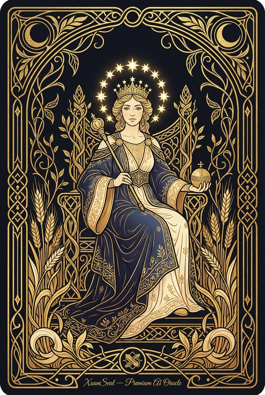 The Empress is one of the most recognizable cards in the tarot deck. In a reading, this card the Empress reclines in a lush garden, her gown flowing with pomegranate patterns, a crown of twelve stars on her head, wheat growing golden at her feet. Her shield bears the symbol of Venus. Whether you have drawn The Empress in a love reading, career spread, or daily guidance pull, its meaning shifts depending on position and context. Below you will find the upright meaning, reversed interpretation, and specific guidance for love and career — everything you need to understand what The Empress is telling you right now. For a personalized interpretation of The Empress in your specific situation, try our free tarot reading tool.