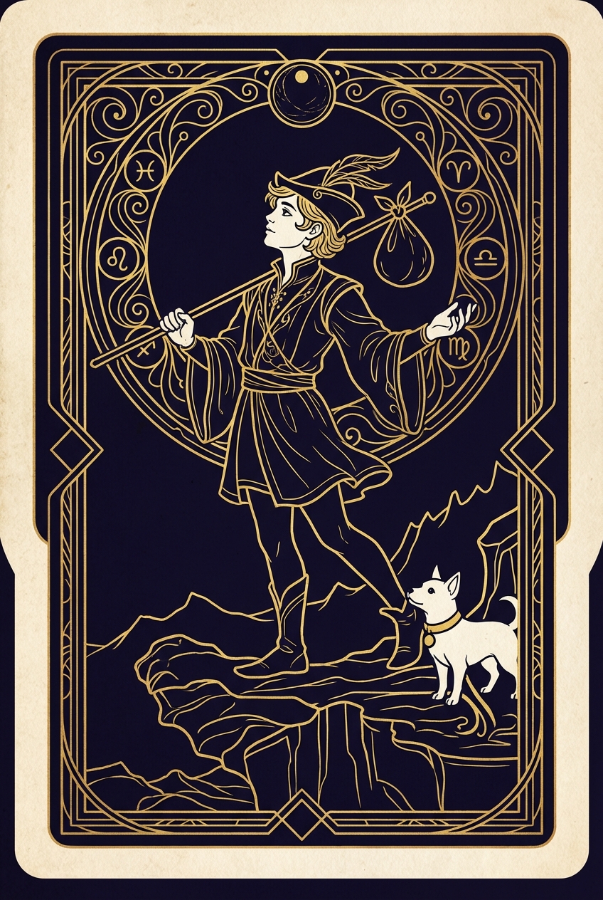Pull The Fool and you have drawn the card of the leap before the net. Numbered 0 in the Major Arcana, The Fool is the only card in the deck without a fixed numerical position — it represents the energy of a beginning so new it has not chosen its direction yet. In a reading, The Fool stands at the edge of a cliff, face tilted toward the sun, a small white dog yipping at his heels. His knapsack carries only what matters, and the vast unknown stretches below.