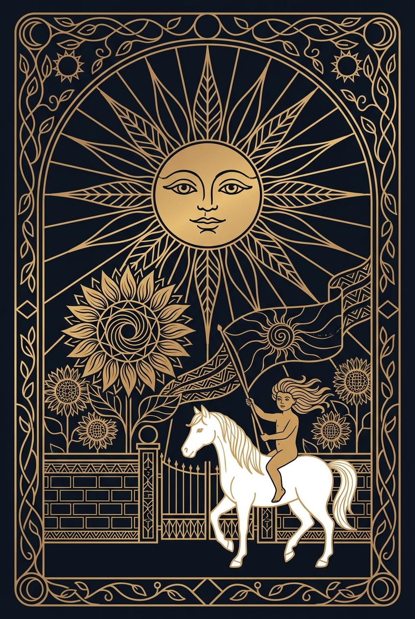 The Sun also carries a quality of childlike wonder. The figure on this card rides with arms wide open, fully present, fully alive, unburdened by cynicism or calculation. This is not naivety — it is the confidence that comes from being in alignment with your purpose and your truth. When you know who you are and what you stand for, there is a freedom and lightness that others can feel in your presence.
