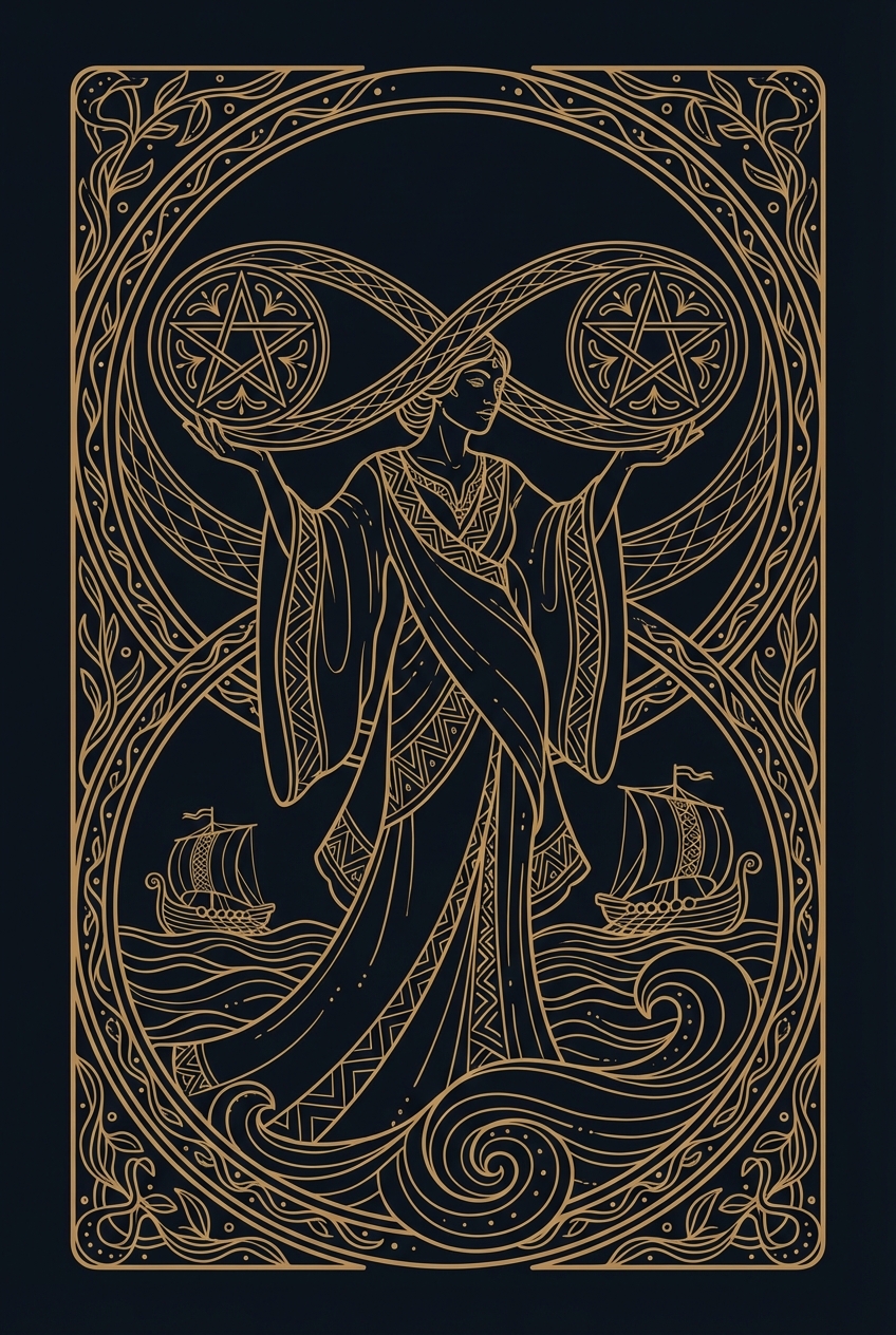 A young figure dances while juggling two golden coins linked by an infinity loop, ships riding waves in the background. The Two of Pentacles is the card of dynamic balance — not the static kind where everything sits perfectly still, but the living kind where you keep adjusting, shifting weight, and somehow staying upright through constant motion. When this card appears, you are managing competing demands. Work and family. Spending and saving. Two jobs, two projects, two timelines pulling you in opposite directions. The Two of Pentacles does not pretend this is easy — the figure is literally dancing to keep the coins in the air. But it does affirm that you are capable of handling it, provided you stay flexible. Rigidity is the enemy here. The moment you grip one coin too tightly, the other falls. The Two of Pentacles asks you to hold your priorities loosely enough that you can redistribute attention as circumstances shift. Think of it as financial and logistical surfing — you read the wave and adjust, rather than fighting the current. This card also speaks to the art of prioritization under pressure. You cannot give one hundred percent to everything simultaneously, and pretending otherwise leads to burnout. Choose what matters most today, give it your focus, and trust that what you set down temporarily will still be there when you return. The Two of Pentacles reminds you that balance is not a destination — it is a practice. Some days you will juggle beautifully. Some days a coin will drop. The skill is in picking it up quickly and resuming the dance without self-punishment.